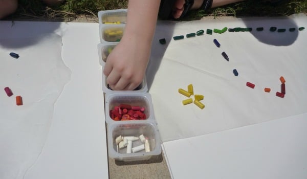wax crayon art. It’s hot enough to melt crayons in my van. Unfortunately, I know this from personal experience. We decided to see how well they would melt outside and experiment with an art project while we were at it.