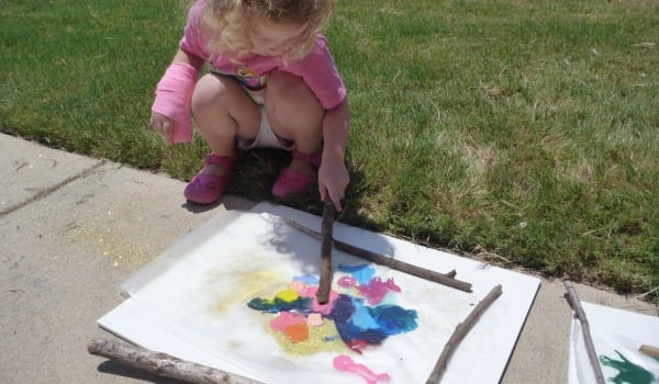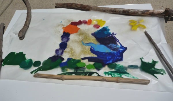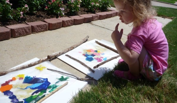 By experimenting, Rachel came up with a whole new twist to our living art project. Instead of just letting the sun have all the melting fun, we decided to use sticks to draw and design with the melted crayons through the wax paper.