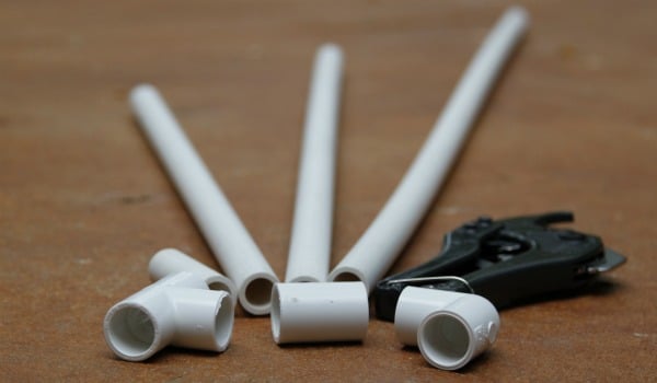 1. My friend had her local home improvement store cut the tent pipes, but my Home Depot was not that accommodating, so I purchased a Ratcheting PVC Cutter to do it myself at home. ย  They are very easy to use and it did give me the freedom to cut the pieces the exact size I wanted once I figured out what we were going to make. ย  I cut 8 of the pipes into 2 – 4′ pieces and one 2′ section.