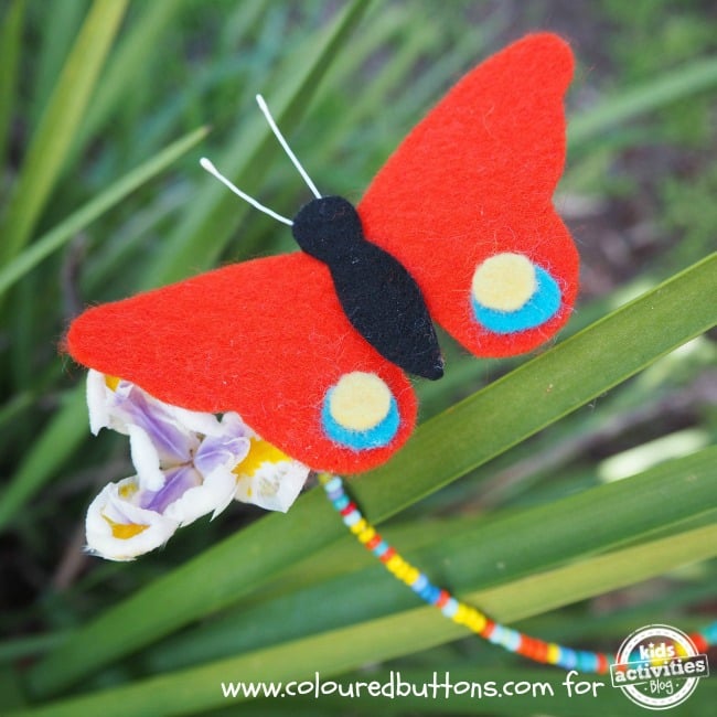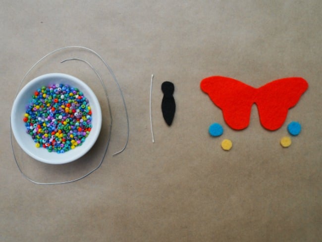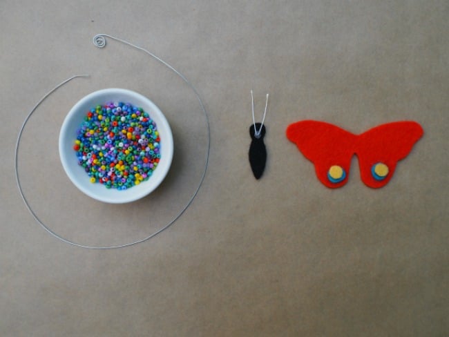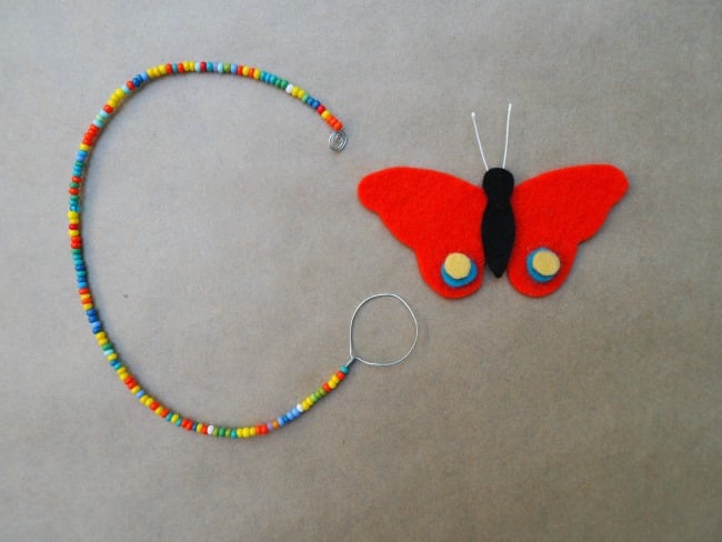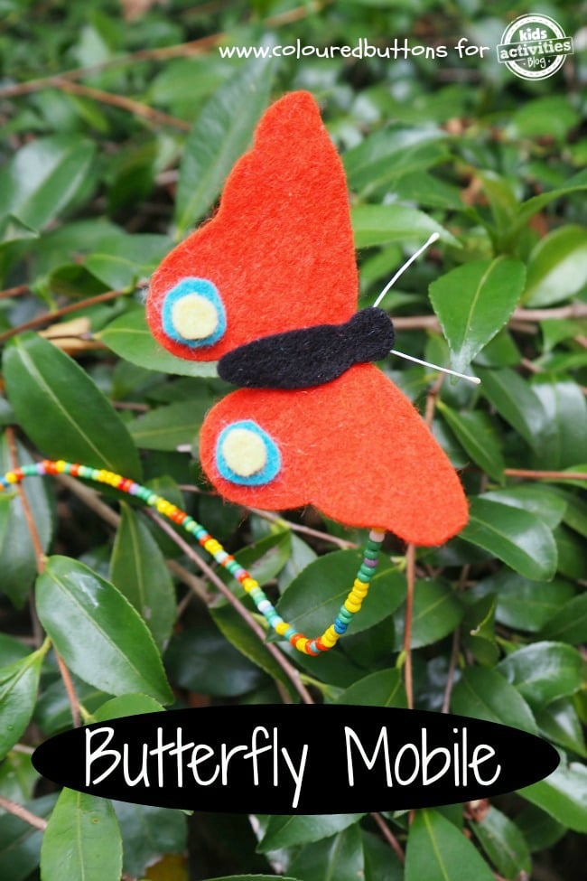 simple butterfly mobile is made with felt, beads and wire. The wire can be easily hung from beds, walls, windows or lamps ¦ and beading on wire is a great activity for kids as wire is much easier to hold and bead onto than string ¦and of course it’s great for hand-eye coordination and fine motor skills and a great way to develop concentration.