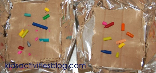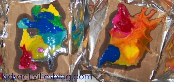 outdoor melted crayon art. She made ink blots using crayons and sheets of wax paper. Hers was a mess free project. Love the results. We decided to use scraps from a cardboard box as our “canvas”. The kids picked out the crayon bits that they wanted to include in their blots and we set our canvases on tin foil to contain the mess. We learned the hard way from our dripping crayons project. No drips onto our sidewalk this time.