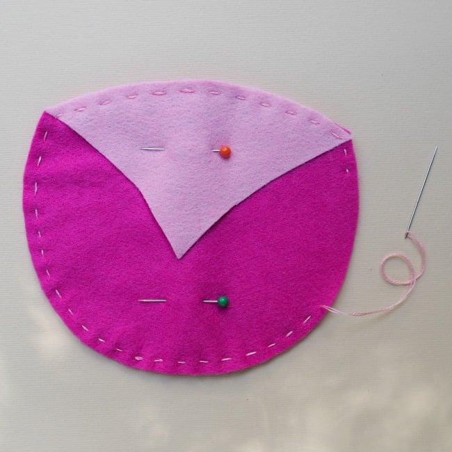 Pin the two body shapes and the beak together an sew around the owl leaving an opening for stuffing as above.