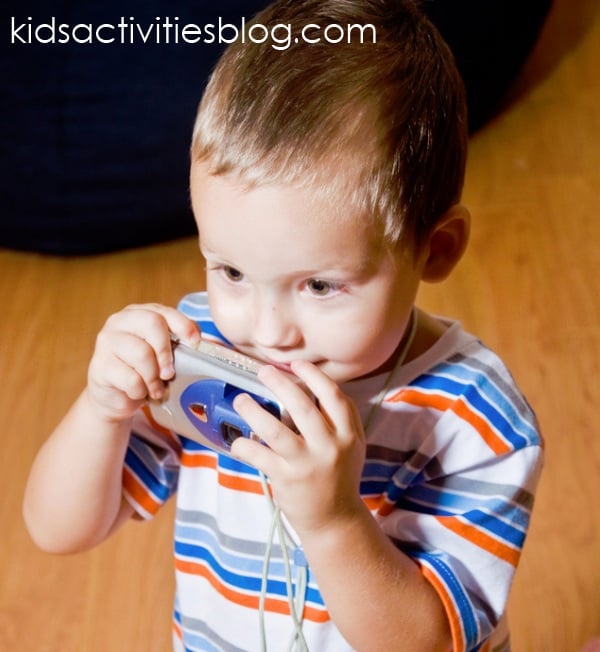 My son loves the camera too! Another great way to keep kids out of your hair while making dinner is to place an easel (our is an inexpensive one from Ikea) in the vicinity. I put lots of washable non-toxic markers, crayons, colored pencils, and dry-erase crayons/markers with it and let my sons create away. While I’m whipping up something hot and delicious, they’re cookin’ up some great art!