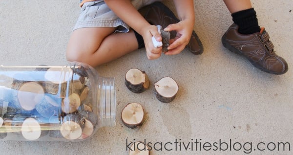 We kept several branches and the trunk of the tree we cut down in a dry place (our garage) for several months to let the wood completely dry out – I also needed time to decide what we were going to create. Then we cut slices out of the branches – ranging from one inch wide to 4 inches tall. We also cut some larger blocks from the thicker trunk (it was a small tree).