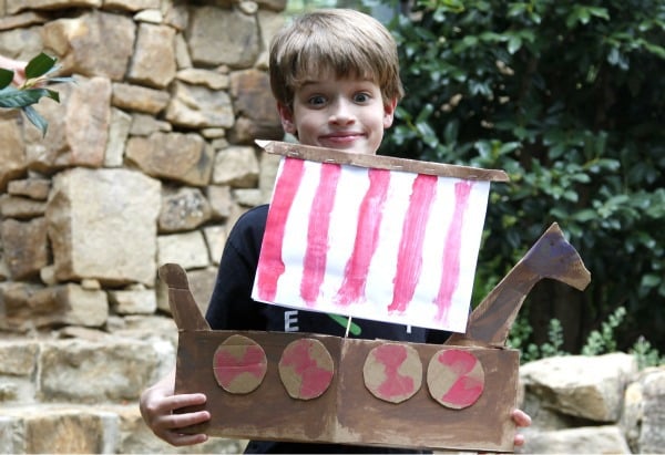 My Reid(8) who is in third grade has been studying Vikings and one of the “enrichment ideas” sent home from school was to make a Viking Longship. Reid has been obsessed with completing this, but over the last few weeks there has been little time available for cardboard boat building. This weekend we finally had some time and he brought out the instructions sent home which were very good. We modified them a bit so he could produce this nautical masterpiece.