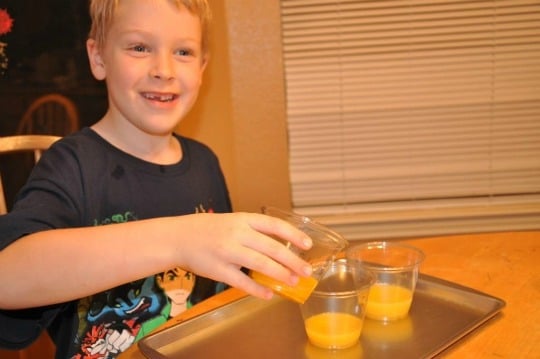 My son loves sour and tangy foods but as you can see from the earlier picture, he thought the full strength orange juice concentrate was way too strong. I was surprised that he still didn’t like the 3:2 ratio because he has eaten some really tangy candy before and love it. He liked the regular 3:1 ratio of orange juice and decided that he would play around with mixing the other ratios together and adding more water to them to try to make them taste better.