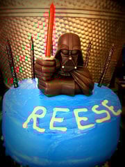 I found an awesome Darth Vader candle holder on Amazon for about $5 (isn’t the red light saber candle adorable?). I made a mini-cake for my son in his favorite flavor & simply iced it blue. I added some black glitter candles I found at WalMart, wrote his name with icing in my quasi-Star Wars font, & he was so happy with how it turned out. I was glad that it didn’t take any skill to do this, & the results were still cute & kid-pleasing.