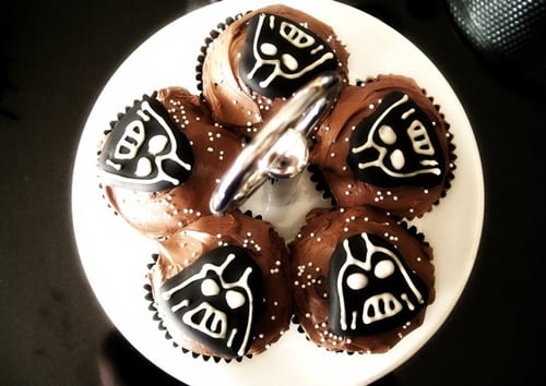 For the Darth Vader cupcakes, I used silver foil cupcake liners & baked some chocolate cupcakes. I frosted them with chocolate icing & added white nonpareils as stars for the background.
