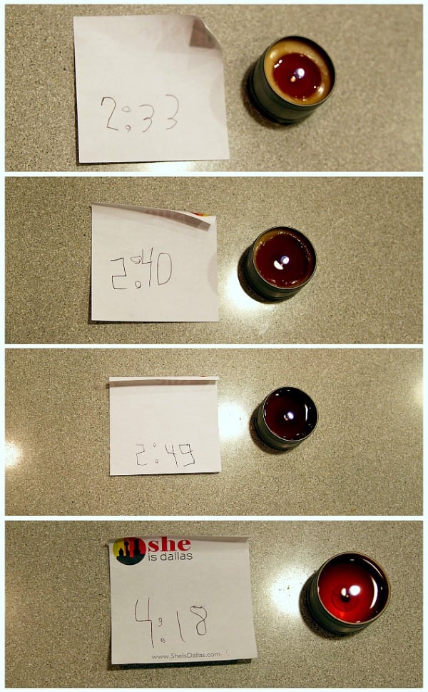 We let the candle burn into the evening. Surprisingly, it was a very slow burning candle and only a small amount of wax disappeared over the entire scientific event.