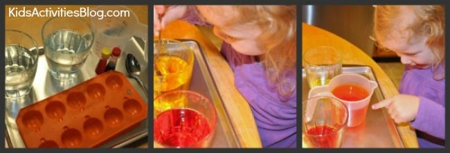 Then she poured the two colored waters together in an empty cup to make orange.ย This isย a super easy way for young children to experience color mixing.ย