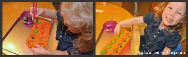 When she tired of that, I showed her how she could make patterns of light and dark green pom-poms.ย She nearly snatched the tongs from my hands to give that a try herself.