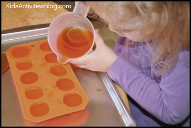 Once we had orange water, I let her practice her pouring skills by pouring the orange water into an ice tray I bought at the dollar store that makes pumpkin shaped ice cubes. ย We can’t wait to plop a few of our orange pumpkin ice cubes in our next glass of water!