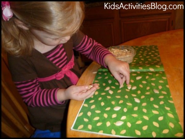 The inside cover of the book is just a green background with lots of pumpkin seeds scattered around. We had some pumpkin seeds from making our jack-o-lantern so I let Rachel play a matching game by placing her real seeds on the seed pictures.