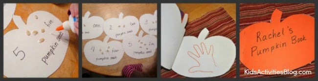 ย I made pages for 1-5 pumpkin seeds then let Rachel count and glue the corresponding number of seeds on to each page.ย There were also a few pages for art work and an outline of her hand.