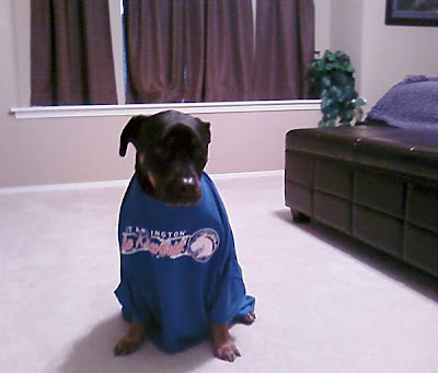 (Poor Strider dressed to show school spirit!)