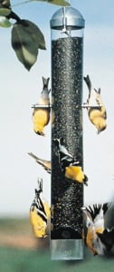 Tube Feeder: Smaller birds are drawn to these tube feeders. You can fill them with any seed, but larger birds like Blue Jays will have a hard time feeding here. We have found that Carolina Chickadees particularly love this style feeder.