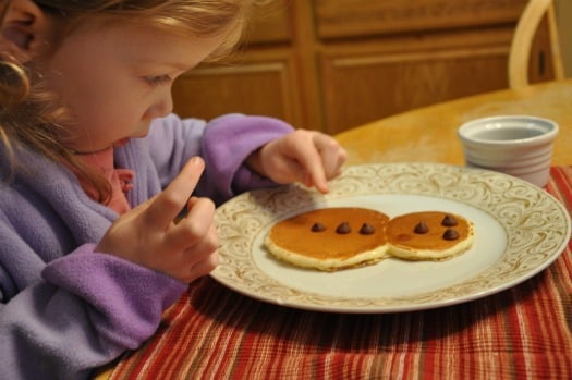 My 3 year old loved placing the chocolate chips just right on her pancake…and then eating them right off as soon as she was done.
