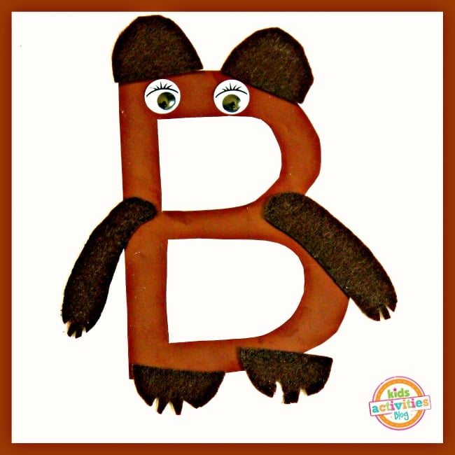 Preschoolers can either draw the letter B shape themselves or use our letter B template. Our favorite part of this letter craft is adding all the felt to make a “beary” cute bear.