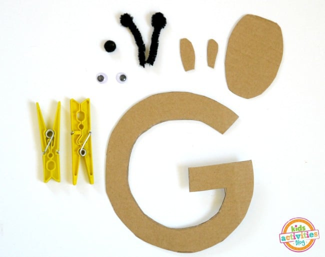 Preschoolers can either draw the letter G shape themselves or use our letter G template. Our favorite part of this letter craft is attaching the clothes clips and pipe cleaners to make a giraffe!