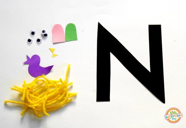 - For the birds face in the nest: Glue googly eyes and beaks to the birds and then glue the birds at the top of the N and at the bottom of the letter n.