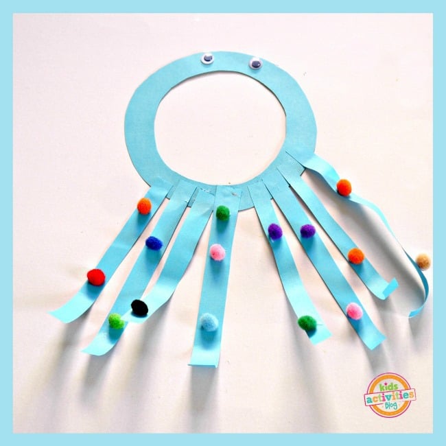 I like this letter O craft, it lets you to add and explore colors with the pom poms instead of accordion octopus legs you see on most octopus paper crafts.