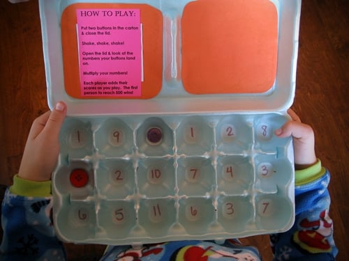 The instructions I glued on the inside of the lid: Put two buttons in the carton & close the lid. Shake, shake, shake! Open the lid & look at the numbers your buttons land on. Multiply your numbers! Each player adds their scores as you play. The first person to reach 500 wins!