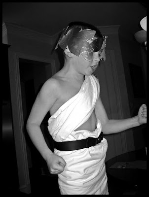My laurel leaf headband was construction paper leaves & a paper sack headband, and my outfit was a sheet with a hole cut in the middle and a rope around my waist. I read multiple accounts that women did not wear togas unless they were prostitutes (!!) so this is NOT a toga! It is a traditional drapey-fabric thing women wore.