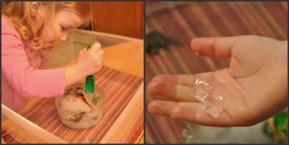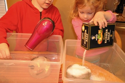 A hair dryer! The hair dryer would really well at melting the ice but I couldn’t let my 3 year old use a hair dryer so close to water so I gave her some salt and let her experiment with melting her ice that way. Here is a neat animation on how salt melts ice that helped explained the process to my son. My daughter didn’t care why it worked. She just loved pouring the salt and rubbing it all over her block of ice.