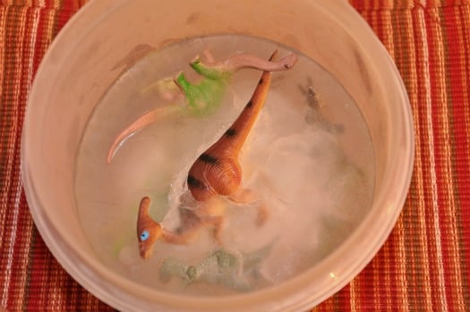 Put a few toys in the bottom of a plastic food storage container, add enough water to just cover the toys and freeze them. Once they were frozen add another layer of toys and water and re-freeze it. Continue doing this until all the toys are frozen. This step takes some time so plan ahead. It’s an important step because it helps to ensure that you will have toys evenly distributed throughout the block of ice.