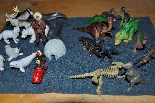 This activity is super easy. Start with some small plastic toys – nothing electrical or with stickers because those could get ruined when they get wet. I made two of ice blocks – one with dinosaurs and another with arctic figures.