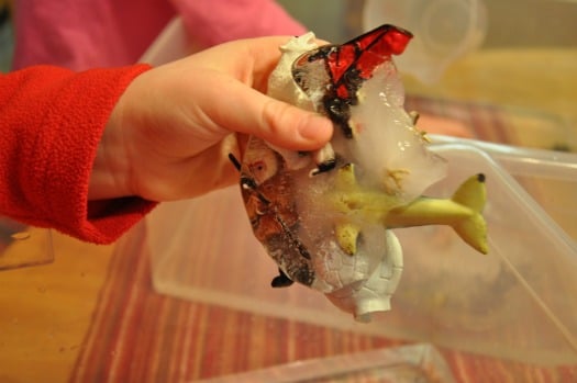 The salt worked well but both of these processes were starting to wear on my kids who still hadn’t gotten enough ice to melt to actually rescue a toy.