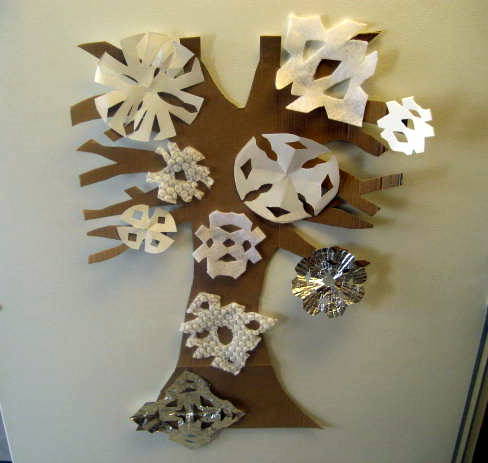 The snowflakes on the tree are made of a variety of types of paper and fabrics. I used flannel, foam, paper plates, foil, and bubble wrap on the tree. ย